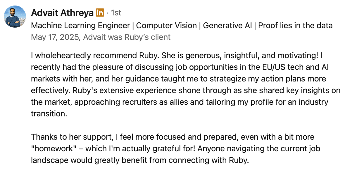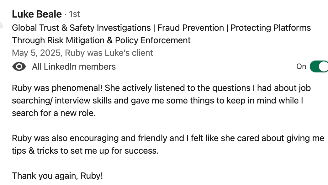 I help experienced to senior professionals transition into 150K-500K roles in Trust & Safety, AI Governance and Compliance roles in Tech Sector. This includes roles from Product Management, Operation, Policy, Compliance, Incident Responses to Program Manager.
